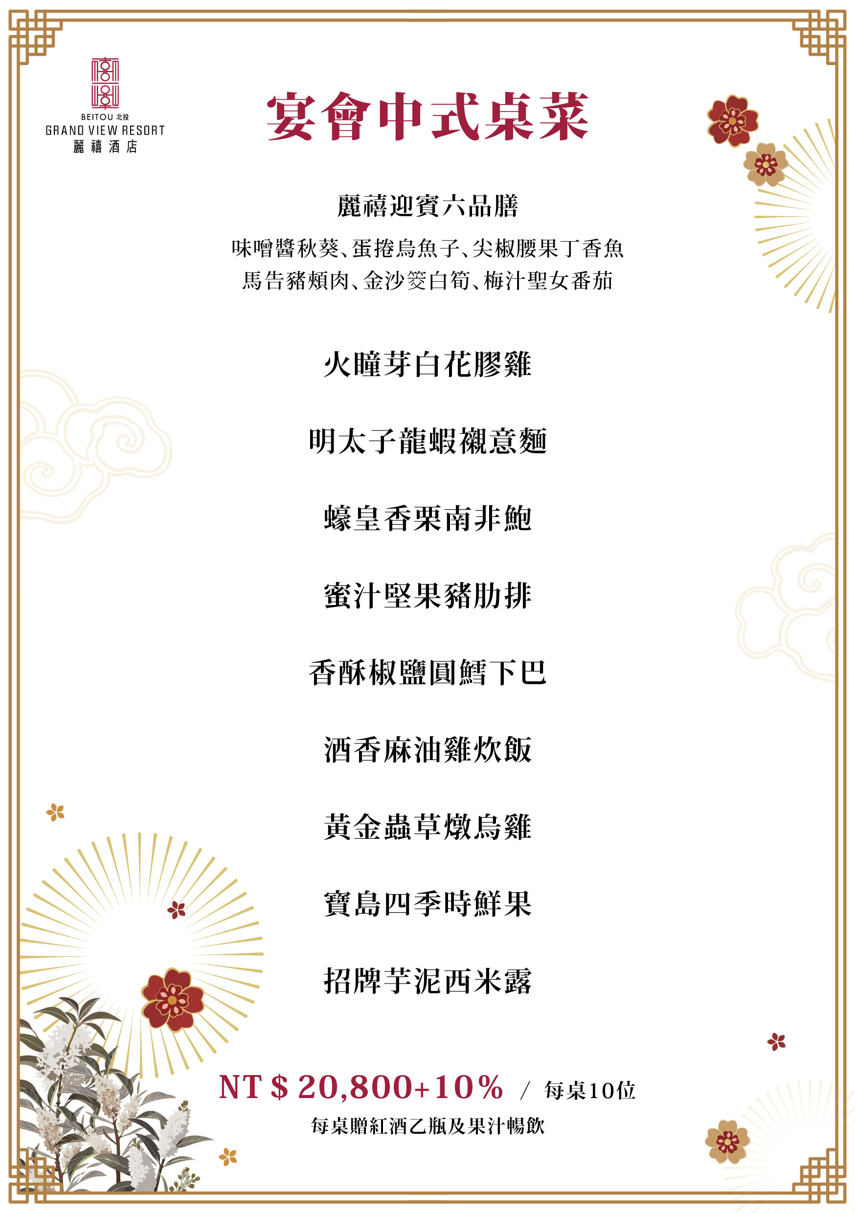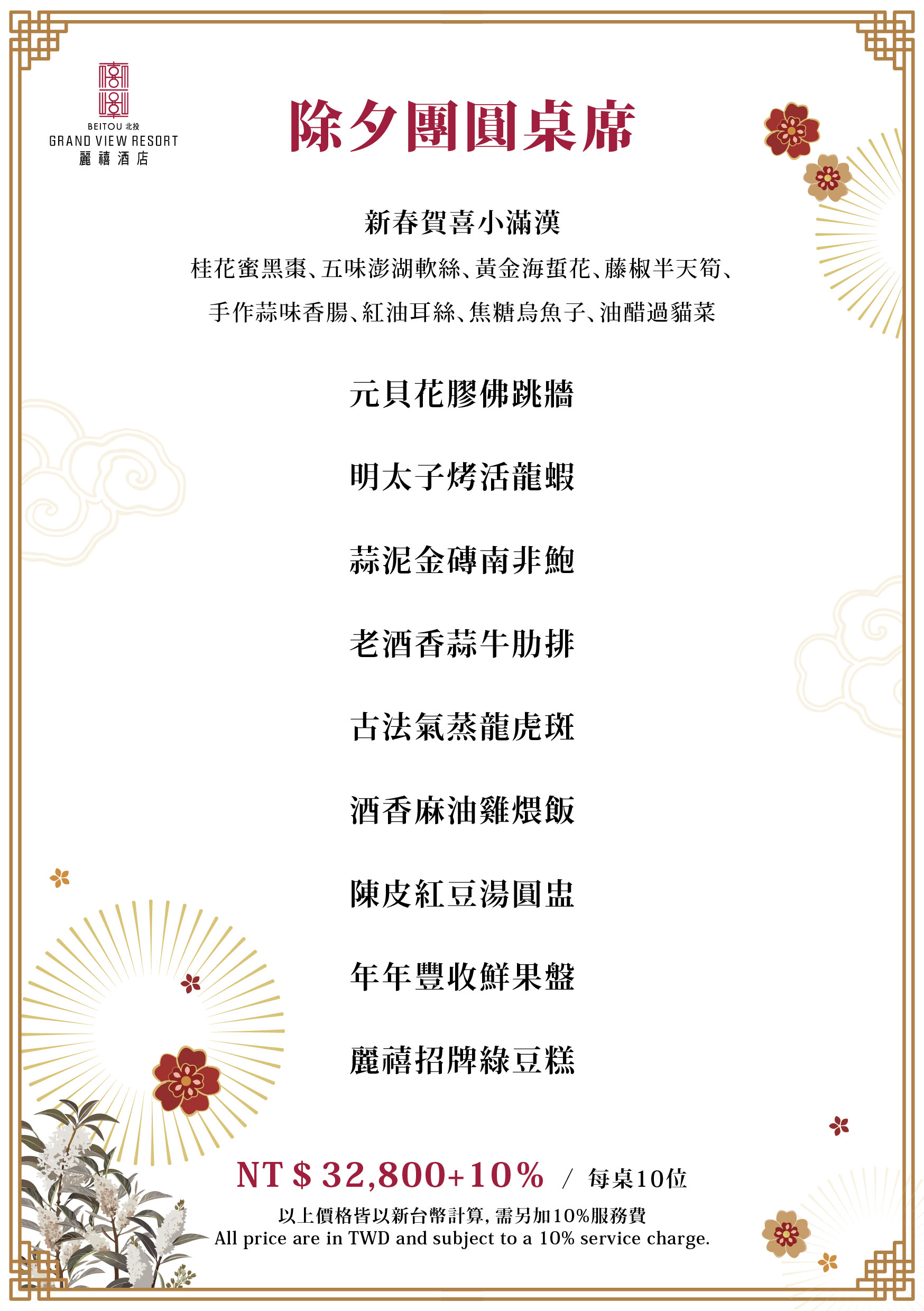 *以上價格除除夕夜套餐已含水資,其餘套餐水資另計NT$120+10%/位。