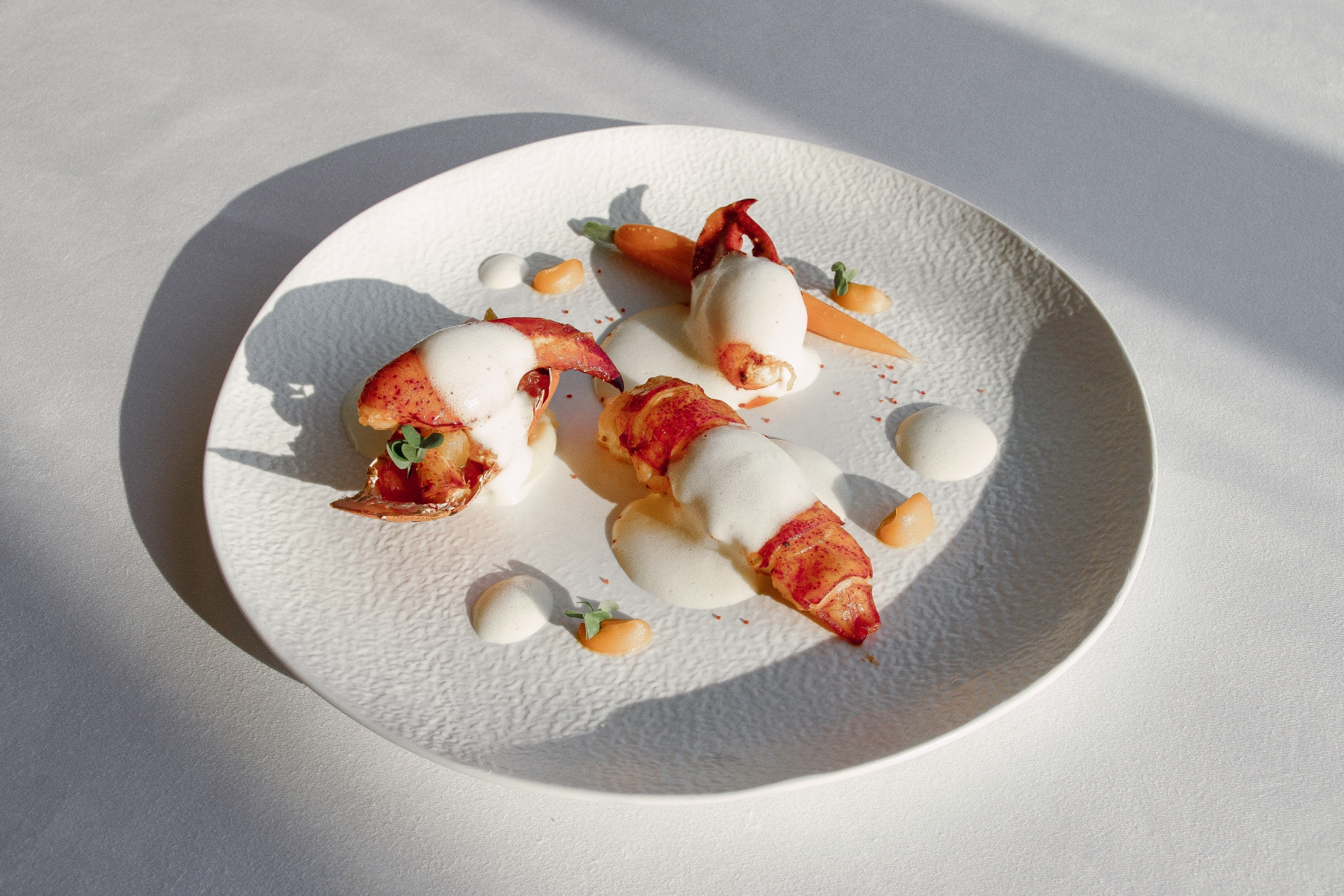 嚴選肉質飽滿的加拿大波士頓龍蝦,以奶油香煎鎖住鮮甜,取出完整龍蝦身肉,展現優雅曲線與豐盈質地。醬汁以法式傳統手法製作,將蛋黃、濃縮柑橘汁與白酒隔水加熱打發,形成細膩如雲的綿密泡沫,輕覆龍蝦之上,香氣柔和而層次豐富。盤飾點綴酸香清爽的柑橘醬汁與細緻紅蘿蔔泥,相互交融間,勾勒出鮮甜海味與清新果香共舞的優雅樂章。