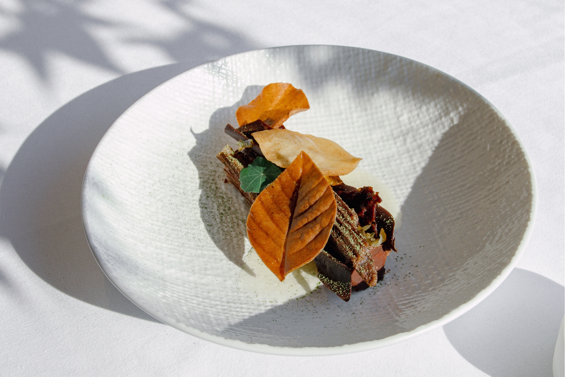 主廚將秋冬森林的靜謐氛圍化作餐桌藝術,以閃電泡芙為靈感,呈現綴有可可枯樹葉的樹幹造型甜點。香脆蕎麥與濃郁巧克力相互交織,點綴清香糖漬橙皮與蕎麥柳橙汁,帶出微酸果香。搭配以傳統古法熬製的純正麥芽糖精心製成的可可麥芽義式冰淇淋,一口入口,層層穀香、巧克力與天然甜香相融,構築出豐富多層次的味覺饗宴。