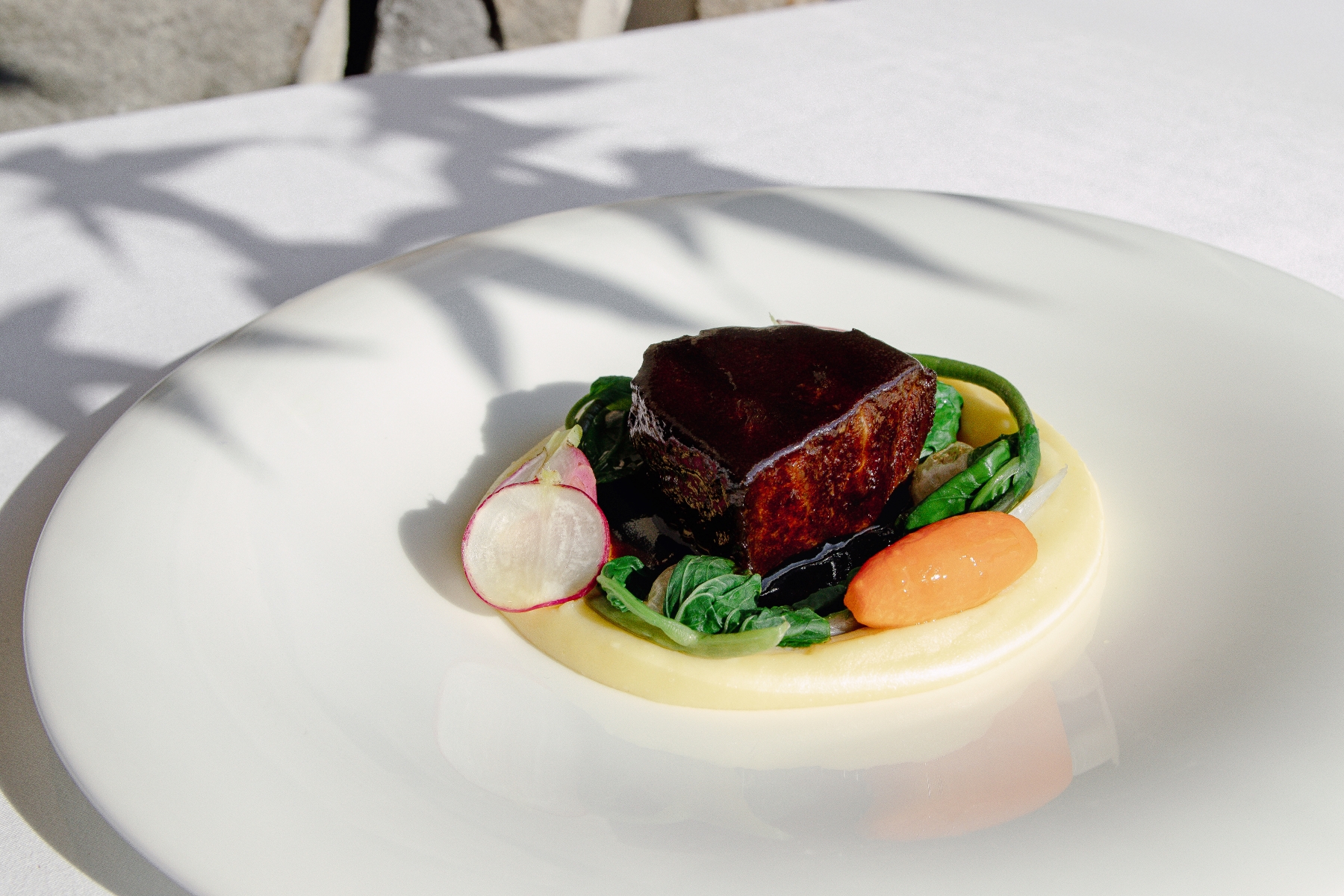 主廚嚴選油花細緻、肥瘦均勻的巧克力和牛臉頰,以醇厚紅酒與牛肉原汁慢火燉煮,歷經長時間細熬,肉質柔嫩細膩、入口即化,盡顯層層旨味。搭配香滑洋芋泥與繽紛季節時蔬,並以珍珠洋蔥、培根碎及洋菇點綴,增添豐富香氣與口感層次,構築出溫潤濃郁的極致饗宴。