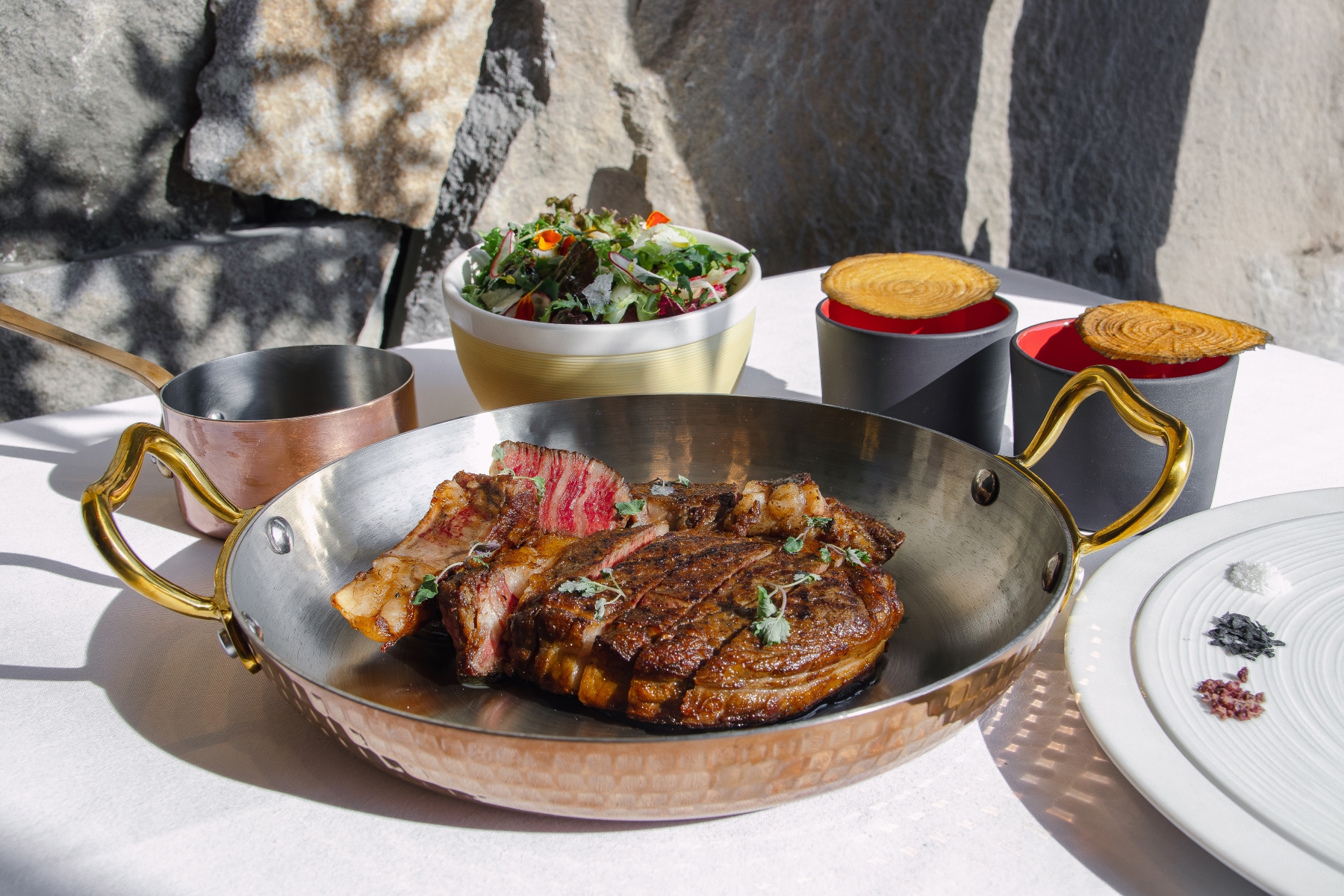 主廚嚴選雲林牧場直送安格斯黑牛,油花勻稱、肉質細膩豐潤。以經典法式工法烹調,先煎烤上色,再靜置讓餘熱使肉汁回流,最後加入奶油回煎,肉質軟嫩多汁、香氣馥郁。可佐以細緻的鹽之花、竹炭鹽或紅酒鹽,亦可淋上牛肉原汁,層次風味更為濃郁。主餐搭配帕瑪森起士綜合生菜沙拉佐無花果油醋醬,以及雙份綿密香滑、奶香十足的馬鈴薯泥,締造豐富而均衡的味覺饗宴。