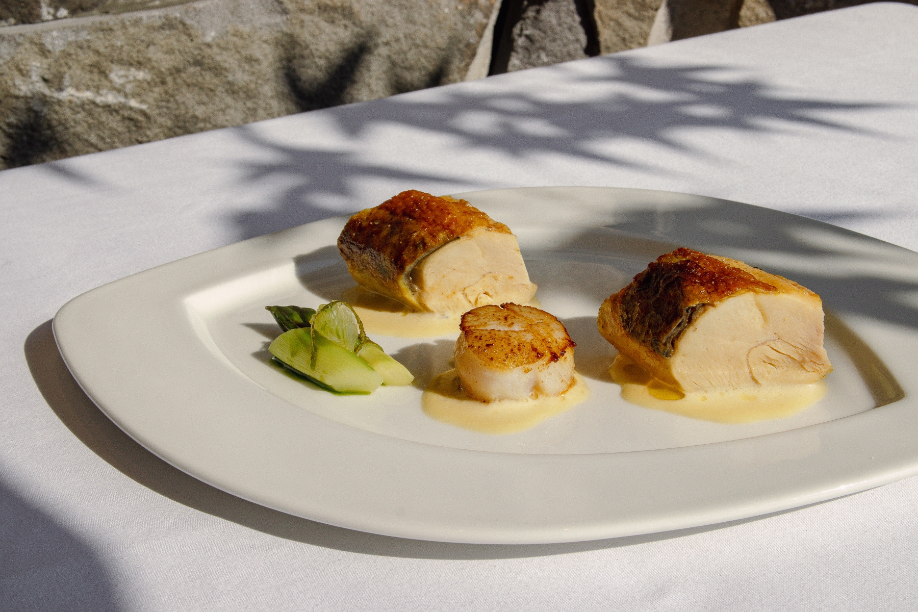 主廚以法式手法重現經典台式酒家菜〈魷魚螺肉蒜〉,演繹出別具巧思的山海新風味。選用新鮮季節魚香煎至外酥內嫩,搭配大火炙香的刻花花枝,輕灑法國甜椒粉勾勒辛香層次。靈魂醬汁以豬大骨高湯為底,融入蝦米、老菜脯、螺肉罐、香菇、青蒜與蔥段慢火熬煮,再細心過濾澄清,化為湯色晶瑩、風味濃醇的魷魚螺肉蒜醬汁,將熟悉滋味化作優雅細膩的味覺驚喜。