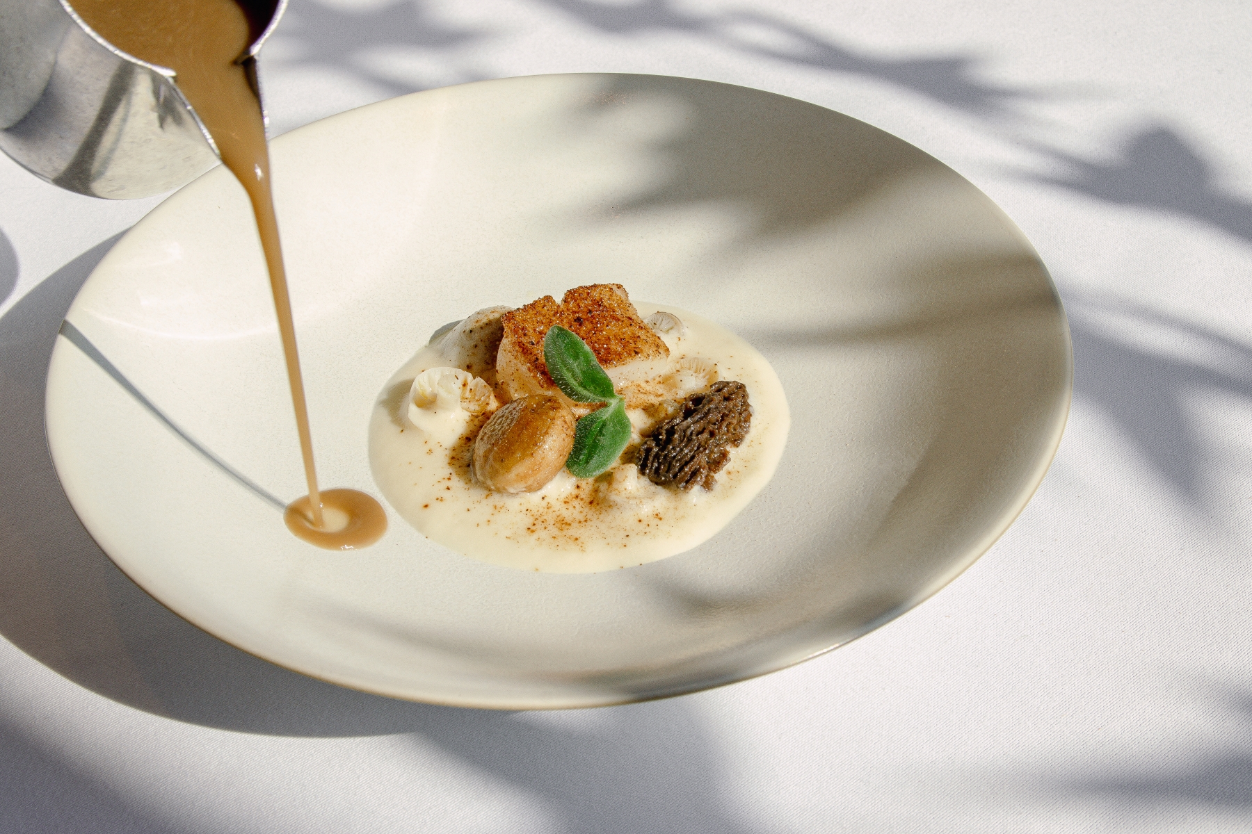 以奶油、白酒與雞湯細火熬煮防風草泥,融合多款菌菇的自然香氣,展現溫潤厚實的底蘊。香煎北海道干貝裹上細緻牛肝菌菇粉,焦香誘人;佐以牛肝菌、香菇、洋菇與雞湯燉煮而成的濃郁菇湯,現場沖入碗中,松露與菌香交織飄散,層層風味在口中綻放。