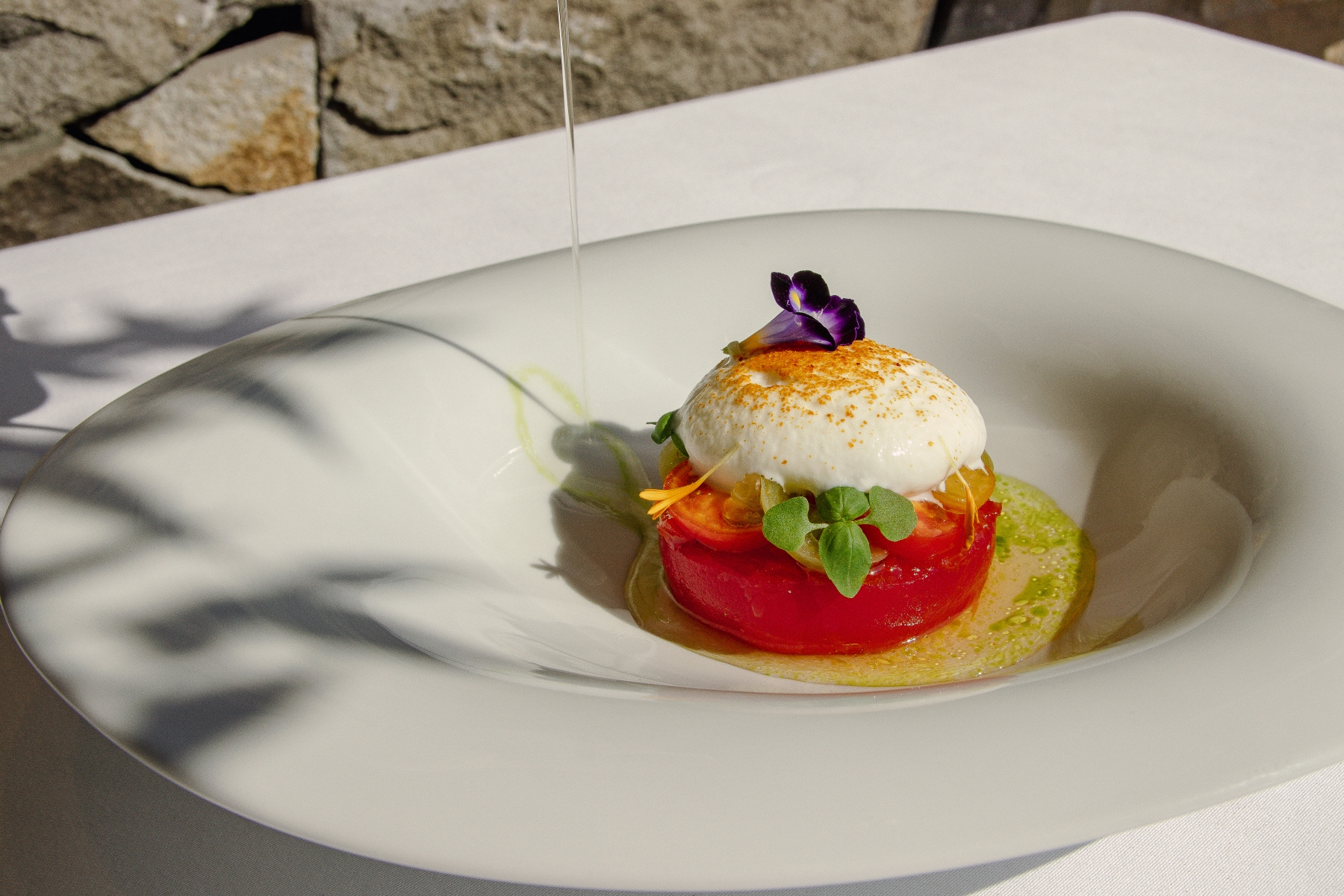 主廚以梅子醋輕漬牛番茄,帶出細緻酸香,再佐以自製番茄果醬,層疊出甜潤果香。繽紛多彩的小番茄與酸甜醋薑,鑲嵌於蓬鬆柔滑、奶香馥郁的布拉塔起司之中,最後注入萃取番茄精華的澄清湯汁,酸、甜、鮮完美交融,譜出一場優雅而繽紛的番茄盛宴。