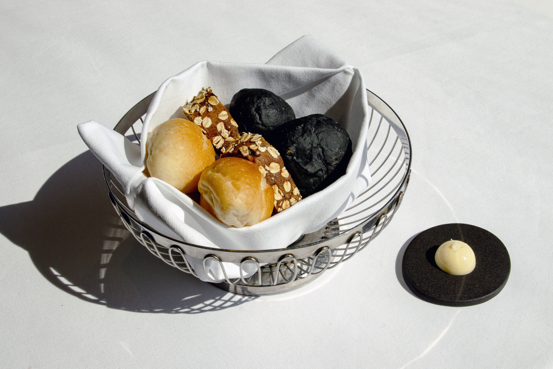 以暖香開啟饗宴的序曲,每日新鮮出爐的三款手工麵包,以職人精神揉捻出極致風味。原味法國麵包選用粉質細緻、帶有淡雅奶香的日本麵粉製成,外脆內韌,展現純粹的麥香層次。竹炭麵包揉入香脆堅果與天然蔓越莓果乾,酸甜交織、口感豐富。紅酒桂圓鹹蛋黃麵包以切片呈現,內餡嚴選台南古法柴燒龍眼乾,以紅酒慢浸一日,釋放飽滿果香與醇厚酒氣,並佐以屏東紅土鹹蛋黃,交融出鹹甜平衡、餘韻悠長的雅緻風味。